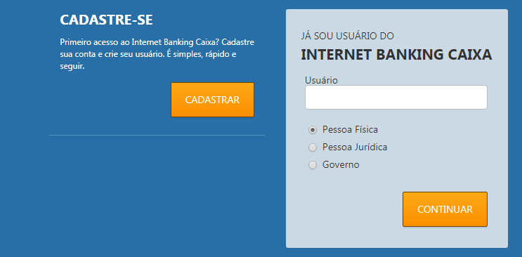 Acesse o Internet Banking da Caixa utilizando seus dados de Usuário. Caso não tenha um nome de usuário Caixa faça o cadastro para criar uma conta e usuário.